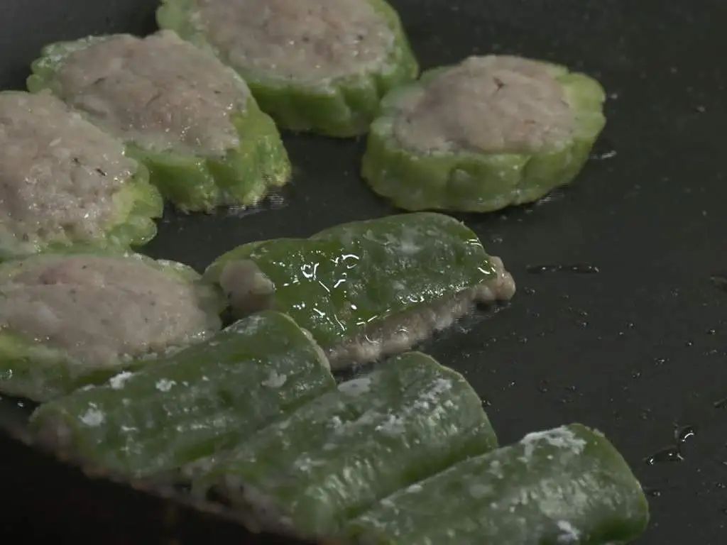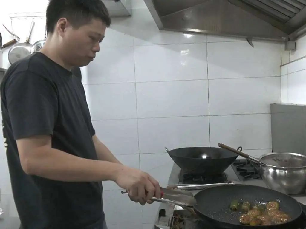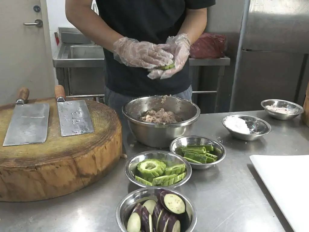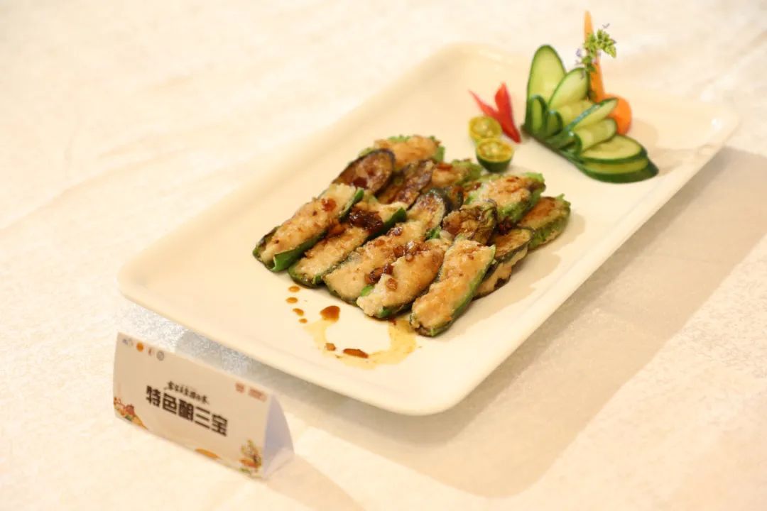 “特色黑松露脆鲩酿三宝”的制作流程与传统酿三宝并无不同。从脆肉鲩上取出一块肉,剁碎加入调料打成鱼胶,酿入苦瓜、茄子和辣椒中,放入锅中煎至两面金黄,再焖上几分钟,再加上黑松露点缀就可以出锅,通过煎香和焖煮使鱼肉与蔬菜风味交融,让这道菜呈现鲜香爽脆的口感。